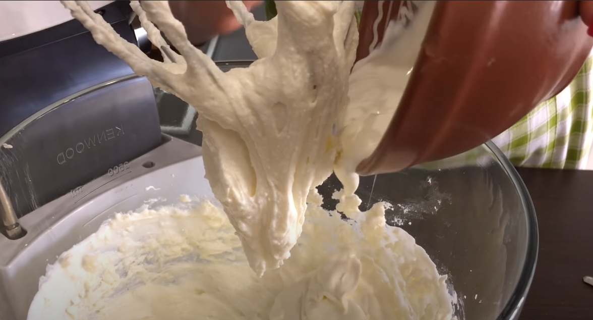 - Начинаем постепенно (чтобы не свернулся желатин) водить сливки в творожную массу и сразу же перемешивать веселкой или миксером (на малых оборотах). Крем для торта готов.