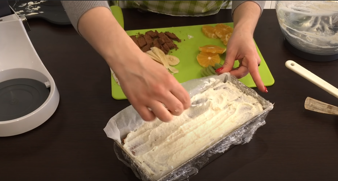 - Достанем из морозильника форму и зальем ее кремом. Затем аккуратно разровняем поверхность лопаточкой и уберем в морозильник на час.