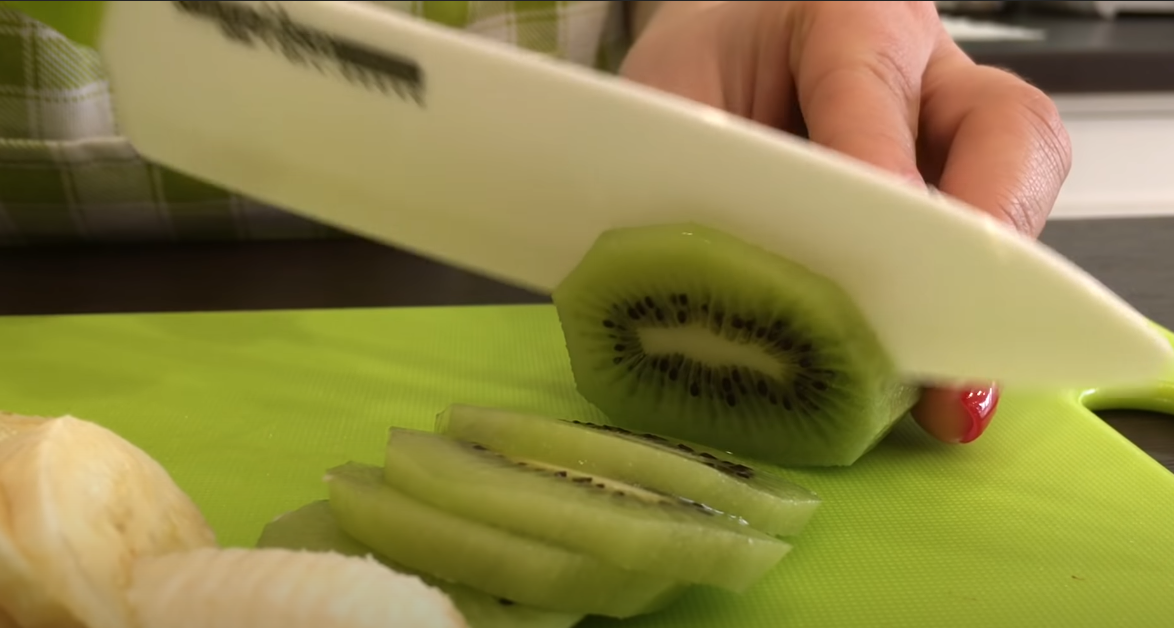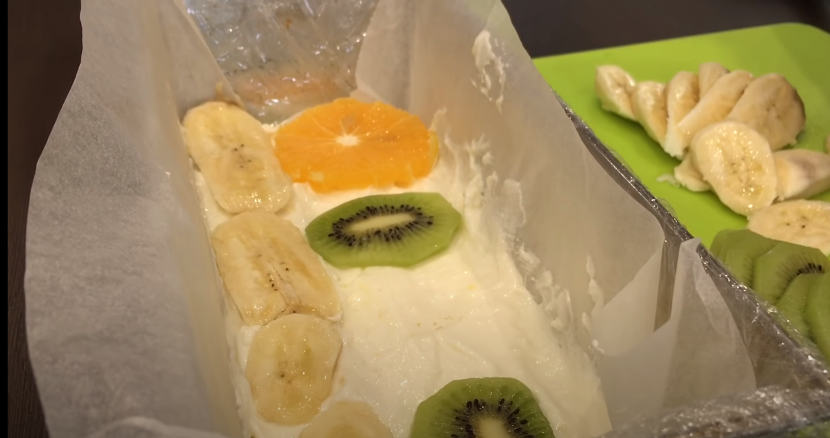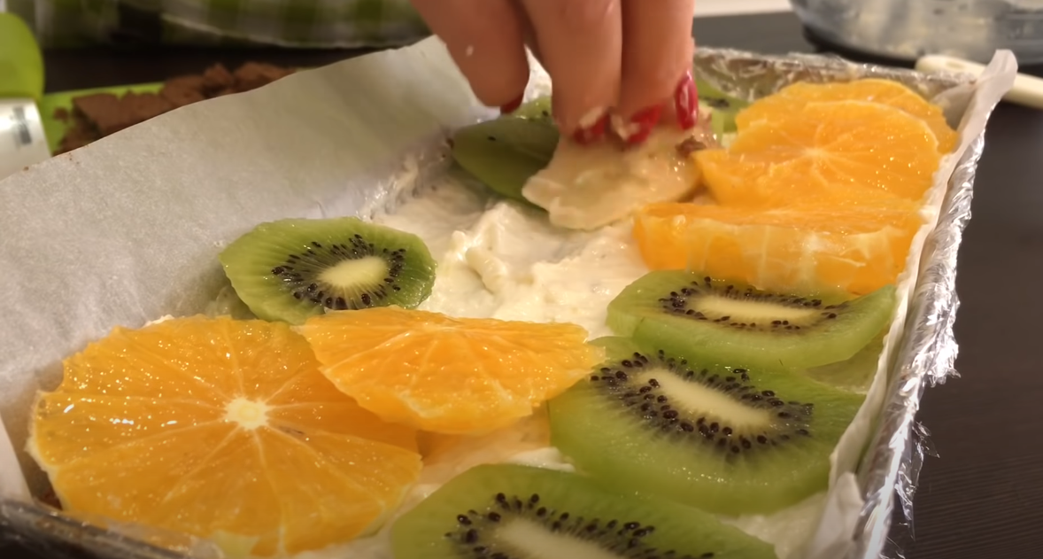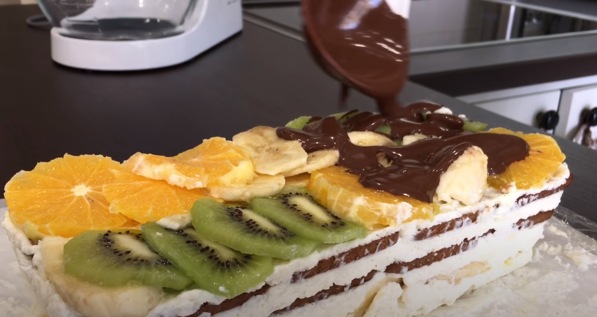 - Очищаем от кожуры апельсин и оставшийся банан, режем кружочками и украшаем фруктами верхушку охлажденного торта.