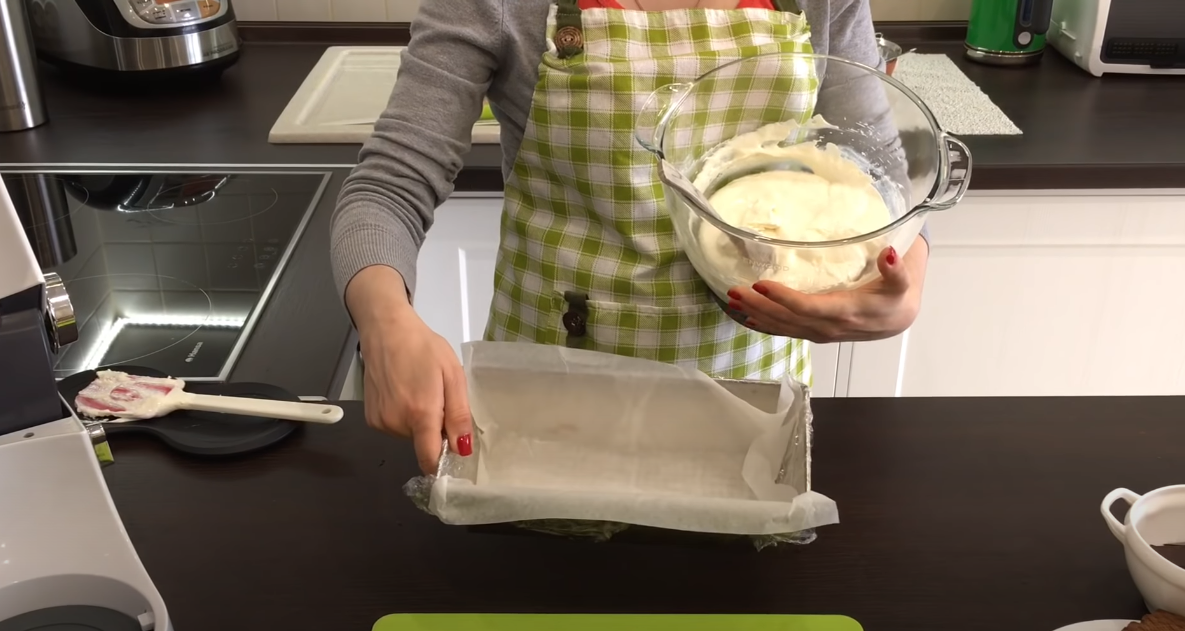 5.Возьмите разъемную форму. Борта можно закрыть пергаментной бумагой. Насыпьте на дно крошку и намажьте ее кремом. Потом снова крошку — опять крем и т.д.