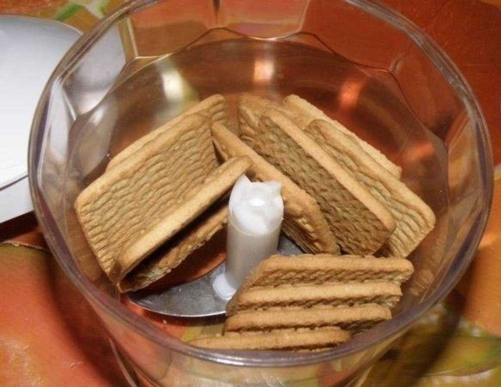 4.Печенье нужно превратить в крошку удобным способом. Проще и быстрее это сделать в измельчителе блендера. Также можно потолочь в ступке или с помощью скалки.
