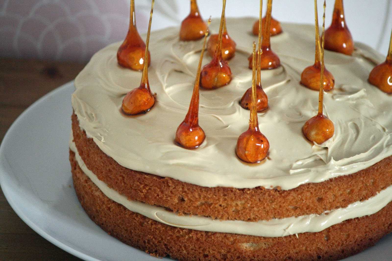 Торт, приготовленный в домашних условиях, получается очень вкусным, но выглядит просто. Чтобы добавит кондитерским изделиям недостающий стиль, не обязательно укутывать их в марципан и сахарную мастику. Достаточно покрыть торт нежным кремом, а в качестве украшения добавить крупные капли из карамели.