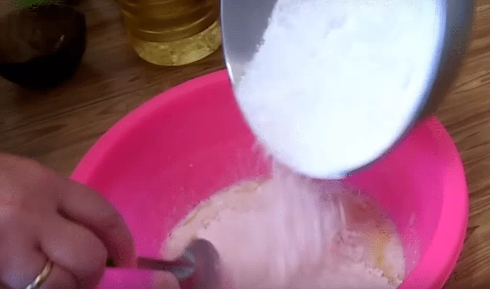 - Влить яично-сметанную смесь опару, вымешать венчиком.