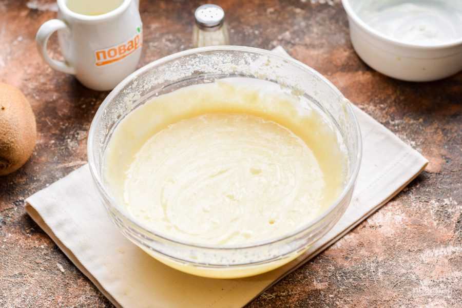 4. Приготовьте жидкое тесто. Для этого смешайте кефир с солью, разрыхлителем, яйцами и растопленным маргарином.