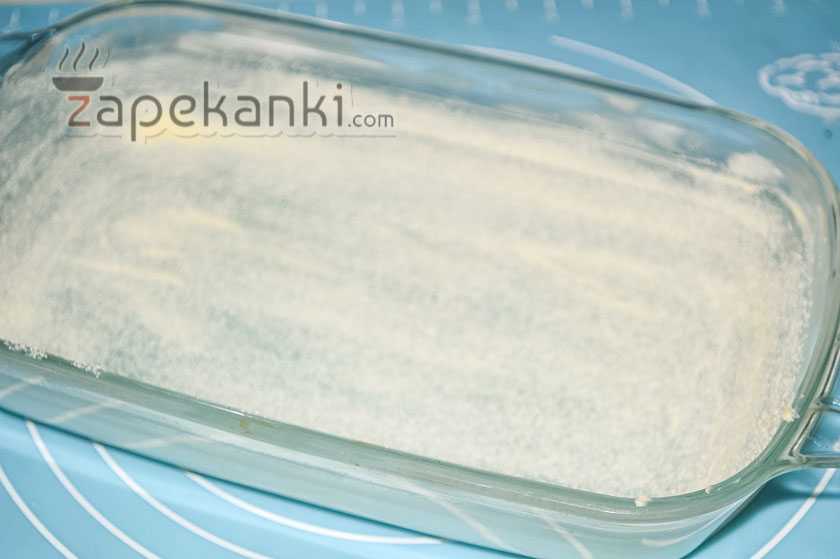 7. Форму для выпекания смазываем маслом и присыпаем манкой, чтобы готовую запеканку легко было доставать. Если используете силиконовую форму, ее смазывать не нужно.
