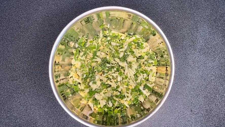 - Смешать тесто с подсоленными рублеными яйцами и луком.