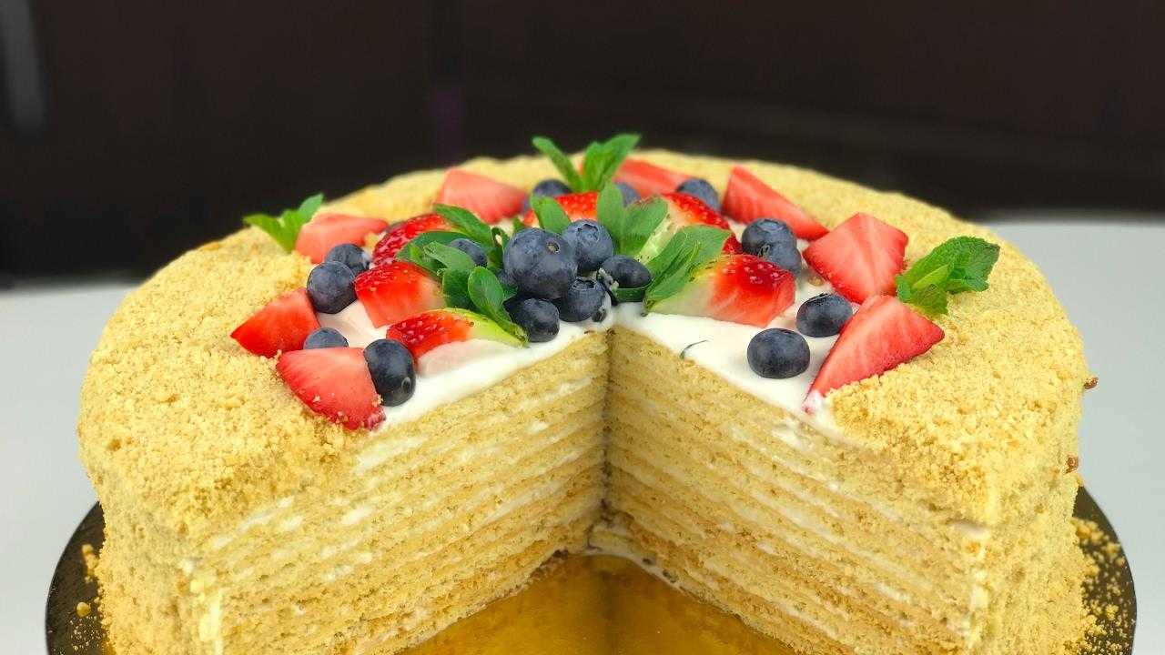 Прогрейте духовку до 180 градусов. Ориентировочно из этого объема теста выходит 18 коржей. Разделите ком теста на равные кусочки и раскатайте каждый очень тонко на присыпанной мукой поверхности стола. Обрежьте по контуру будущего торта и выложите тонкий корж на противень. Наколите корж вилкой и отправьте в духовку. Как только он немного вздуется и станет золотисто-коричневым, он готов. Достаньте его из духовки и сразу щедро смажьте кремом. Укладывайте торт сразу на блюдо для подачи. Украсьте, оставьте изделие на пару часов при комнатной температуре, после чего отправьте на 6 часов на нижнюю полку холодильника. Приятного аппетита!