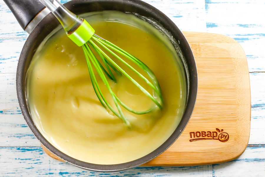 Заварите крем примерно 3-4 минуты до нужной густоты, не забывая его помешивать. Правильный заварной крем — густеет уже при заваривании, а не остается жидким!