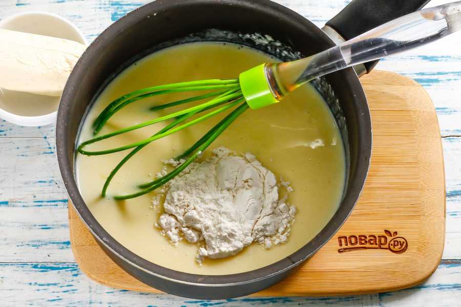 - Влить в полученный состав молоко комнатной температуры, перемешать и поставить на небольшой огонь.