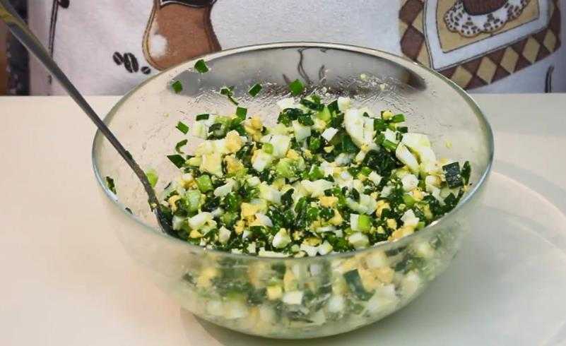 1. Мелко нарежьте зеленый лук и вареные яйца. Выложите их в глубокую миску, добавьте соль и перемешайте.