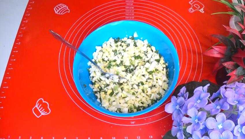 Яйца отвариваем вкрутую, охлаждаем, очищаем и рубим маленькими кубиками. Смешиваем яйца с подготовленным зеленым луком. По желанию, начинку можно поперчить.