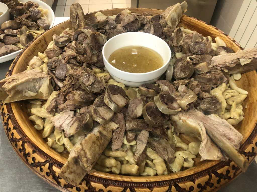 Чеченское национальное блюдо подается таким образом: выложим галушки в большую посуду, наверх – небольшие куски мяса. Присыплем нашинкованной зеленью, в соуснике подаем соус Берам. В него макаются мясные ломтики. Можно залить соусом все блюдо. Можно подать блюдо иначе, главное ведь его вкус.