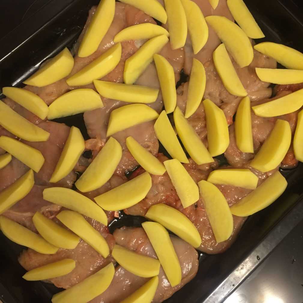 Чистим картофель. Нарезаем на дольки. Укладываем по верх куриного филе.
