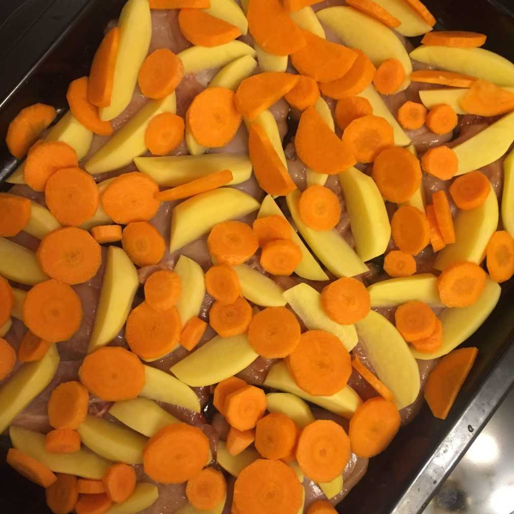Картошка поможет сделать это блюдо более сытным, а соус и специи придадут пикантность. Запекать птицу с овощами мы будем в фольге.