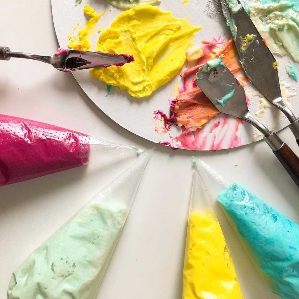 Поскольку бисквитное тесто содержит много воды (яичный белок, молочные продукты), то для его окрашивания лучше всего подходят пищевые водорастворимые красители. Водорастворимые красители могут быть представлены в трёх формах: жидкой, сухой, гелевой. Чтобы избежать попадания лишней влаги в бисквитное тесто, для его окрашивания рекомендуется использовать именно сухие порошкообразные или гелевые красители.