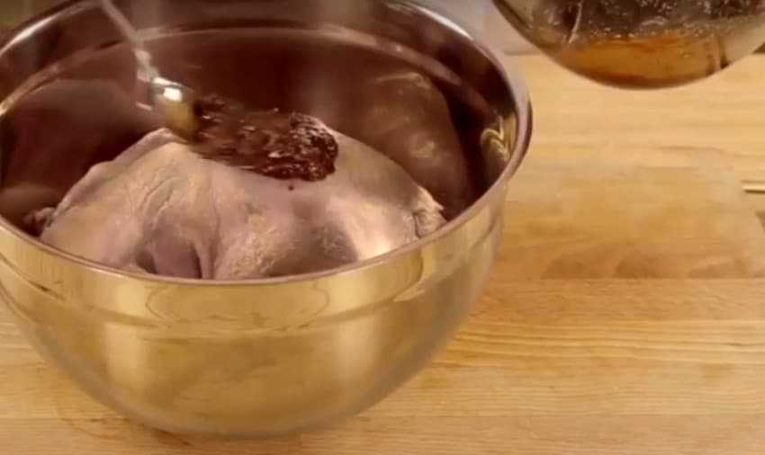 Снять пленку и тщательно обмазать цыпленка маринадом. Мариновать при комнатной температуре 40-60 минут.