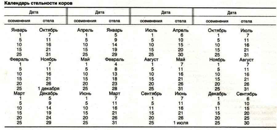 Для определения даты отела также ведется специальный календарь. Это таблица отела коров, в которой отмечены месяц и день осеменения и отела.