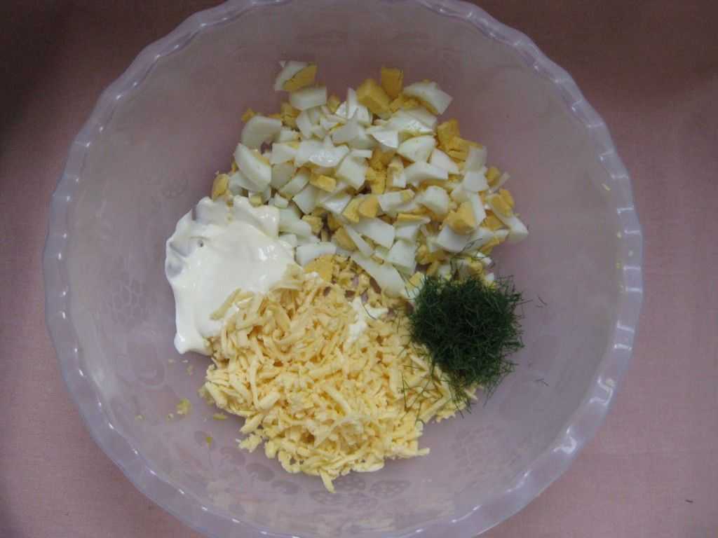 Включаем духовку на разогрев в 200 градусов Цельсия и ставим на столешницу небольшую противопригарную либо жаростойкую форму для запекания, дно которой при большом желании можно застелить пергаментной бумагой либо пищевой алюминиевой фольгой. Дальше отправляем в глубокую миску измельченные яйца, мягкий сыр «Фета», половину твердого «Российского», по вкусу майонез, соль, душистый молотый перец и предварительно выдавленные через специальный пресс зубчики чеснока. Перемешиваем эти продукты столовой ложкой до однородной консистенции – начинка готова!