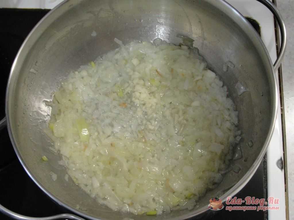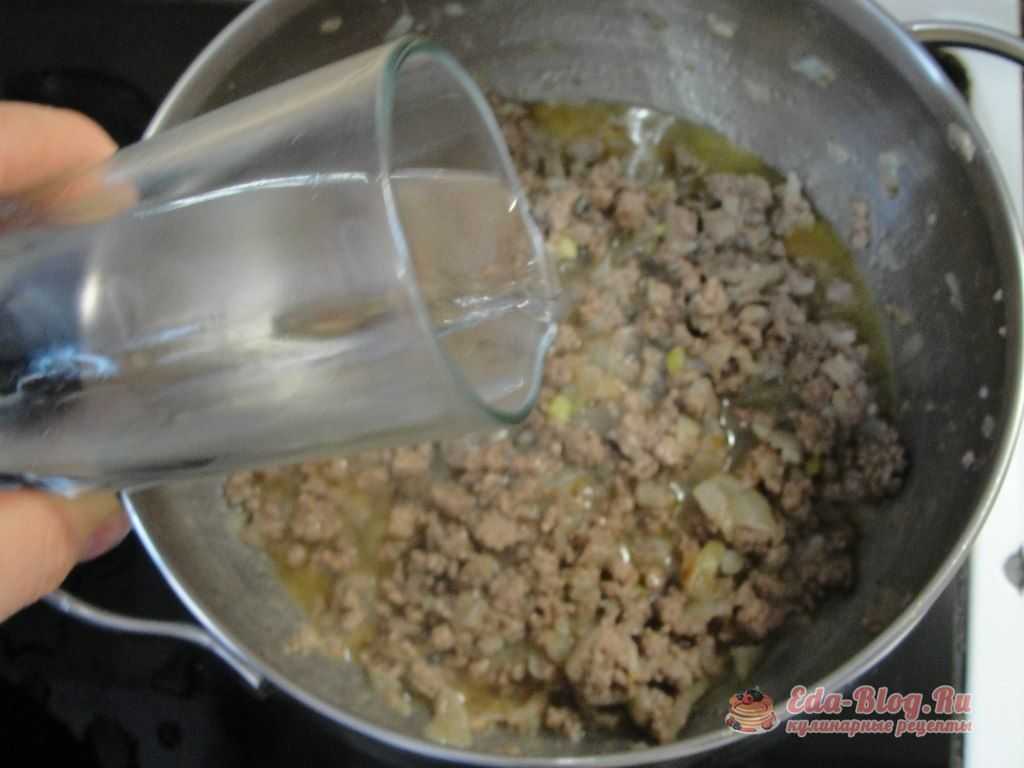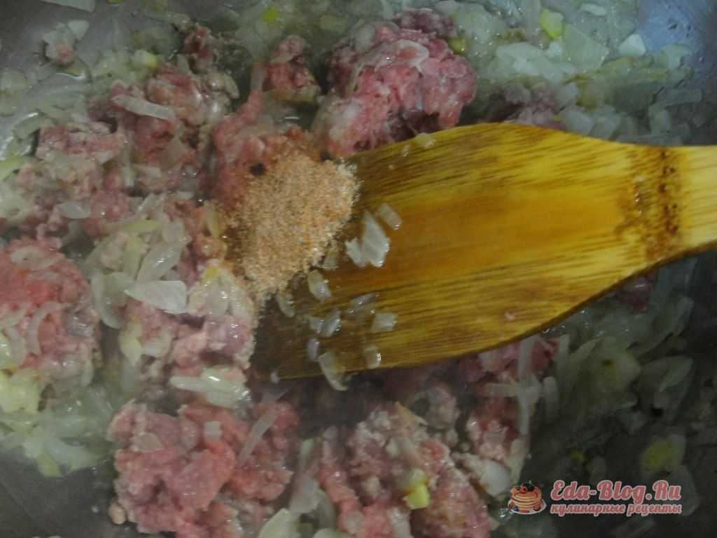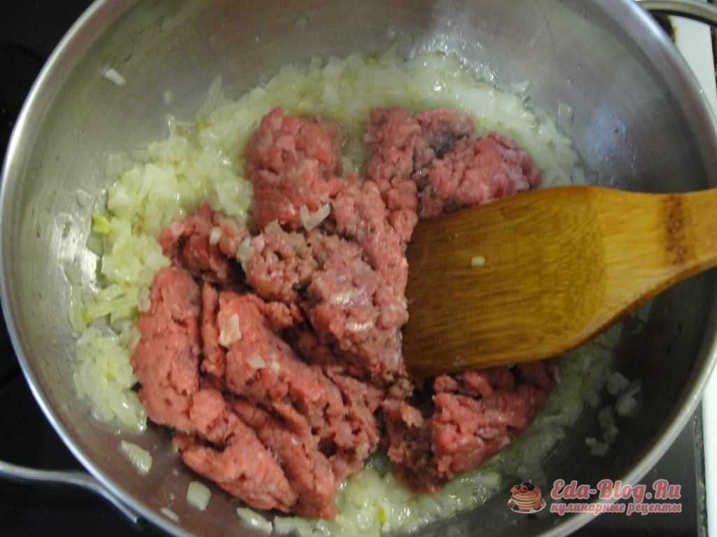 Когда лук с чесноком посветлеют закладывайте фарш.