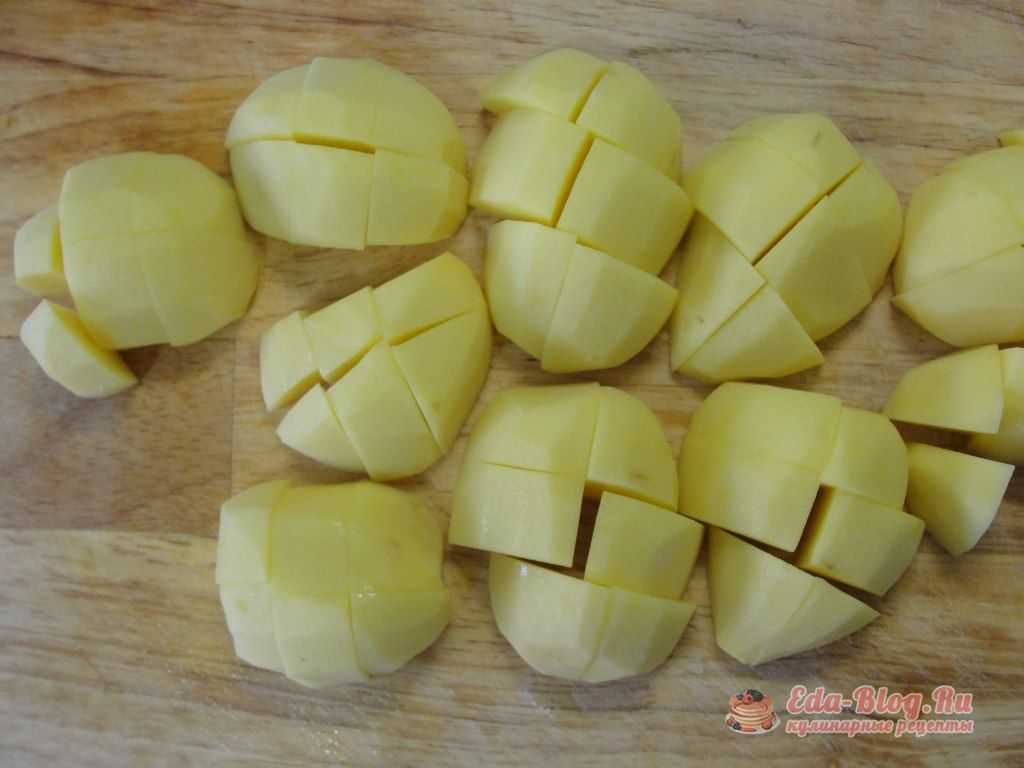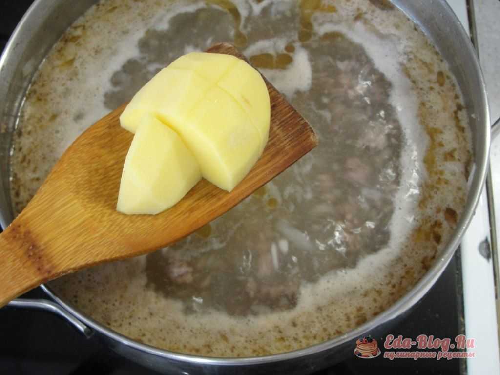 - Картошку почистить и нарезать средними кубиками. Добавить к супу. Варить еще 20 минут.