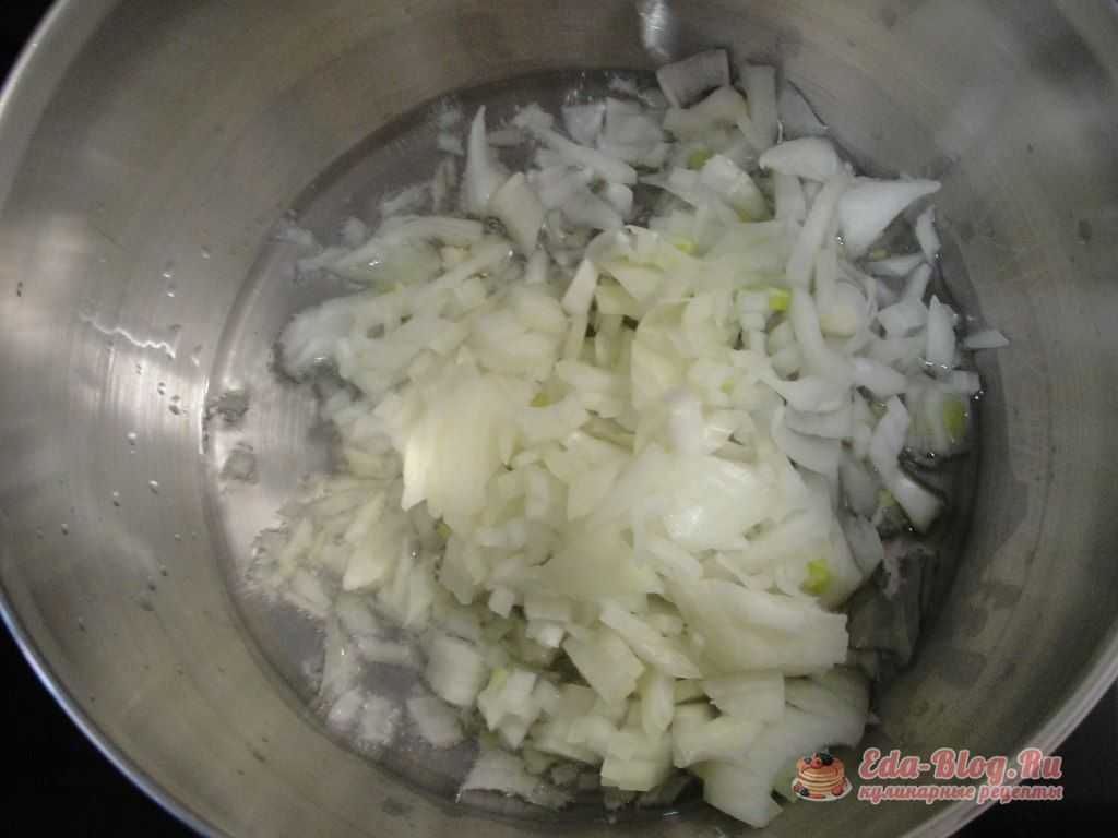 Луковицу порежьте мелким кубиком. В кастрюле с толстым дном нагрейте 3-5 ст.л. масла и забросьте лук обжариваться.