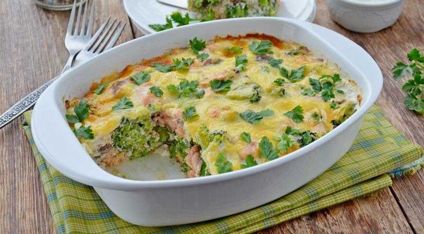 Красную рыбу порежьте на небольшие квадратные кусочки. Форель с брокколи переложите в форму для запекания, смазанную кусочком сливочного масла.