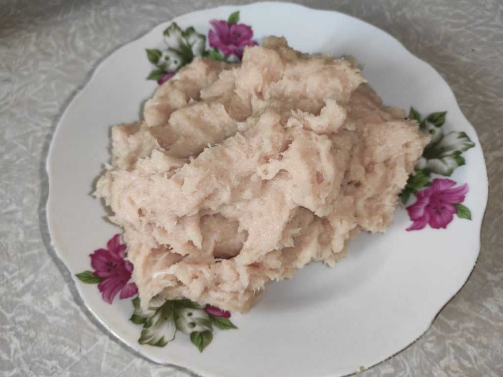 Хорошенько вымешиваю массу. Не ленюсь, это важная часть процесса! Кидаю, как мячик, для того, чтобы животные белки соединились с водой, все ингредиенты равномерно распределились, просолились, и смесь стала более плотной.