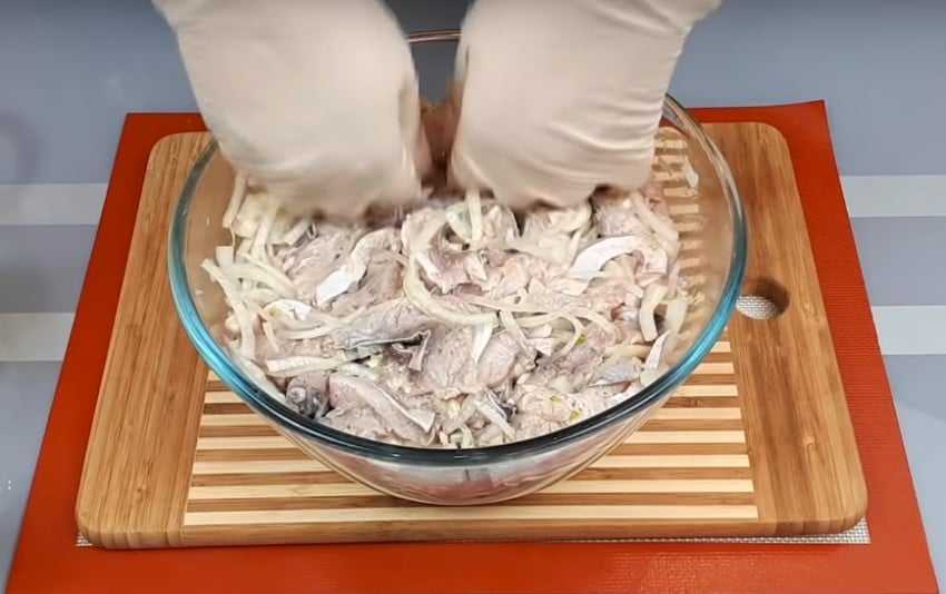 - Перетрите их с солью и уберите настаиваться в холодильник на 3 часа.