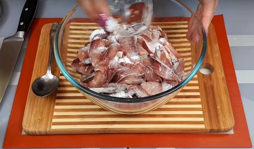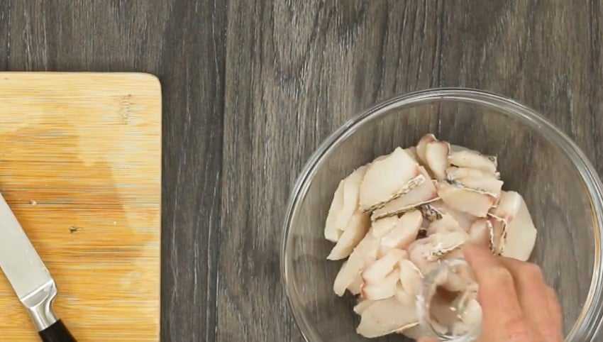 - нарезать филе продолговатыми кусочками, толщиной 1 см, залить разведённой уксусной кислотой, постоянно помешивая, и оставить в холодильнике на 30 минут, после чего воду слить;