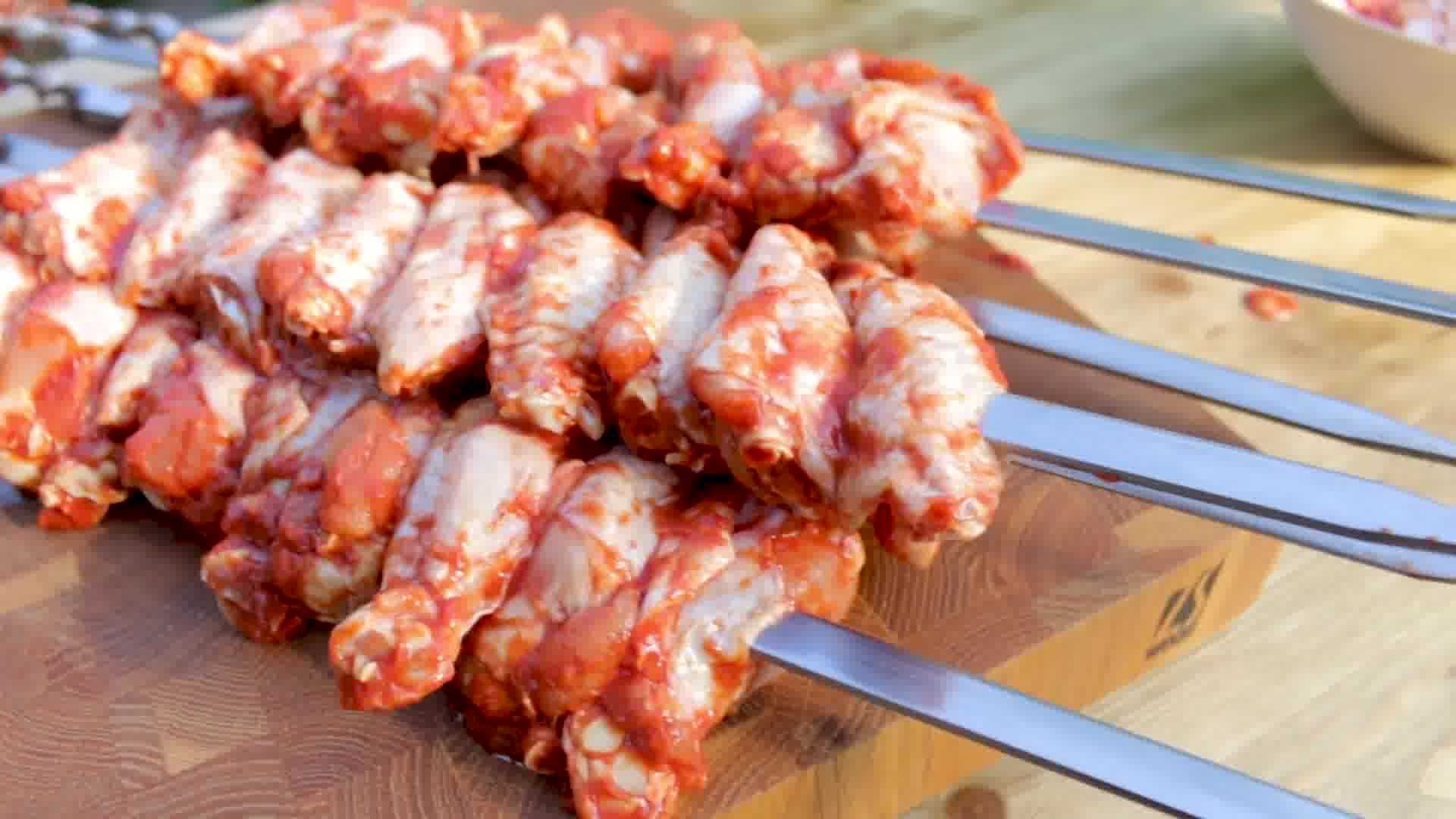 Вы также можете пожарить крылышки на шампурах. Однако в этом случае каждое крыло придётся нанизывать на два шампура одновременно.