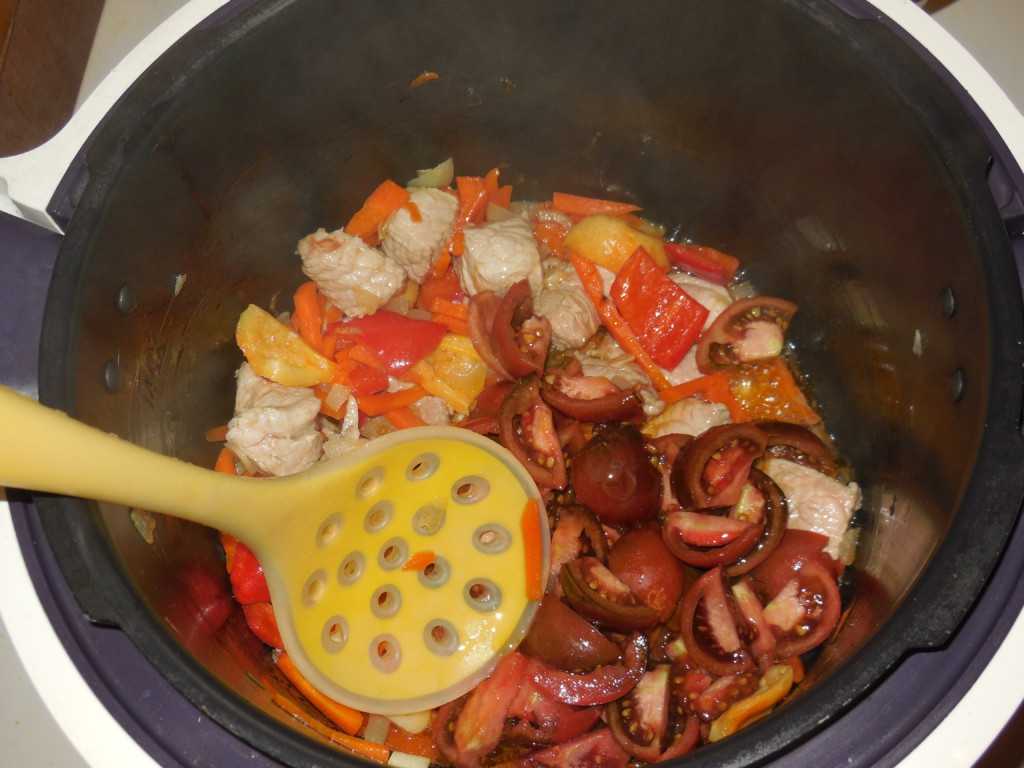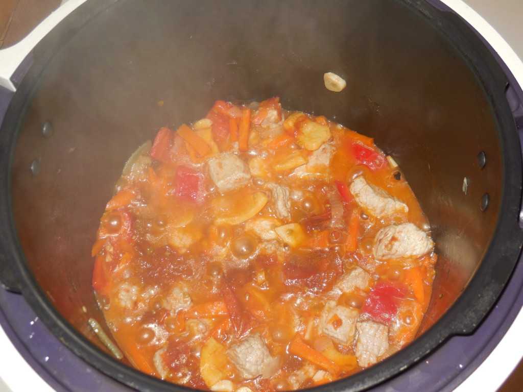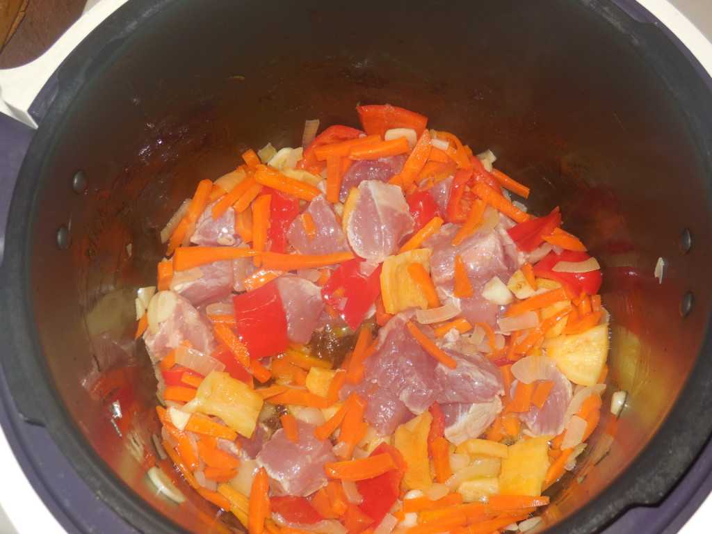 - Через 7 минут к овощам присоединить мясо, готовить до окончания программы.