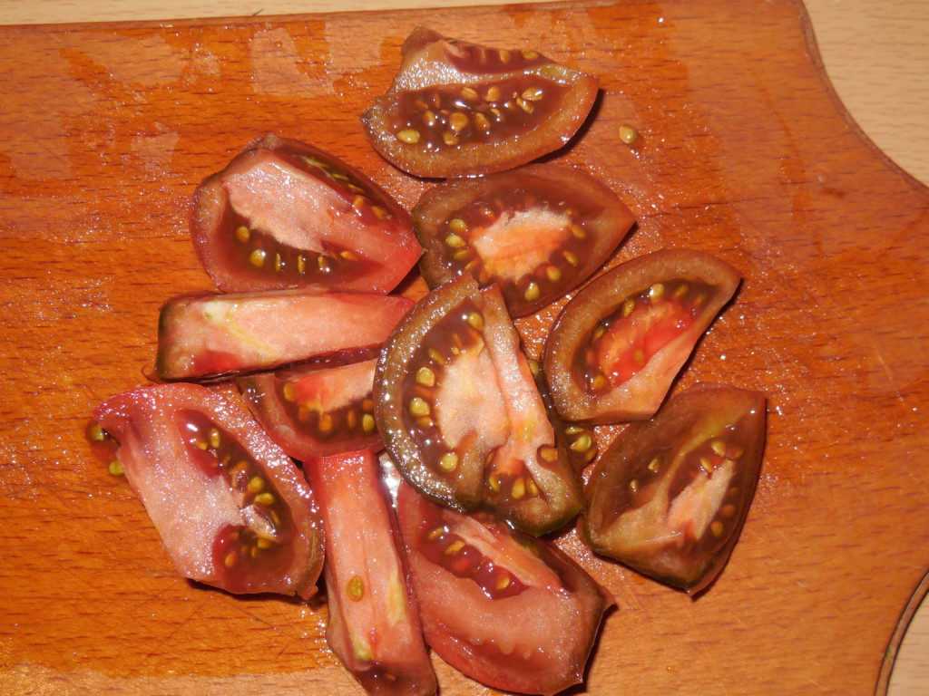 Дальше у помидоров вырезаем середцевинки и нарезаем томаты крупными кусками (мелкие режем пополам, крупные на 4 части).