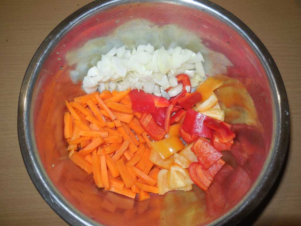 Включаем мультиварку на режим «жарка» и наливаем в чашу подсолнечное масло. После прогрева мультиварки высыпаем в чашу морковку, лучок и болгарский перчик и, помешивая лопаткой, слегка обжариваем их.