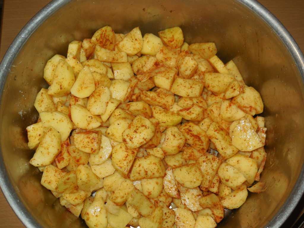 Еще один небольшой момент, но важный момент: красного острого перца я в картошку добавила совсем немного и готовое блюдо будет лишь слегка островатым. Для любителей более острых блюд советую перца добавлять 1 ч.ложку.