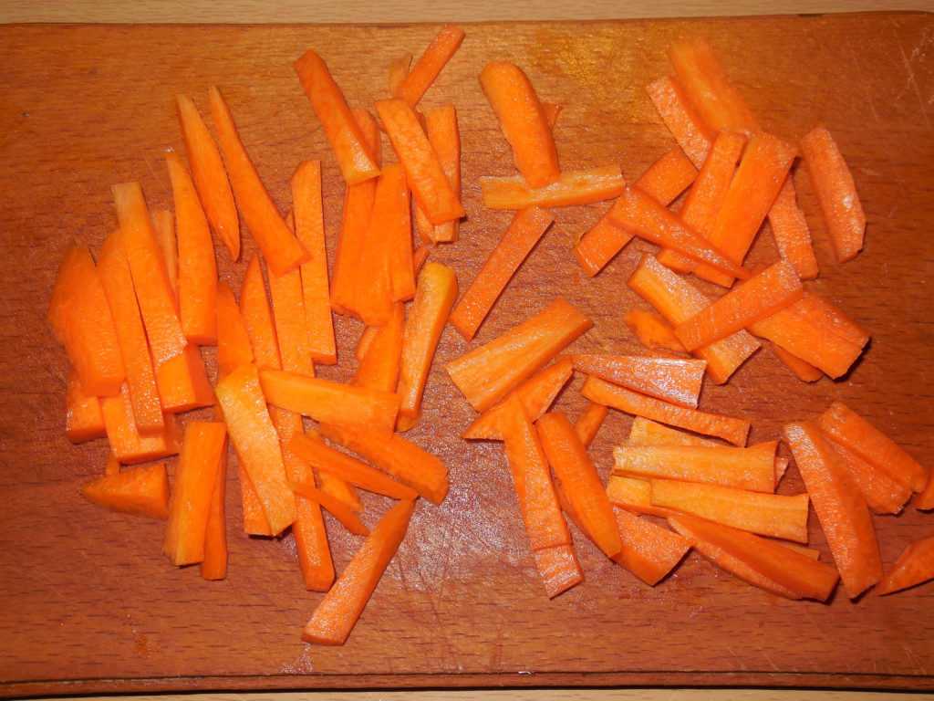 Начнем приготовление нашего рецепта с подготовки овощей. Морковь чистим от кожуры и с помощью острого ножа нарезаем тоненькой соломкой.