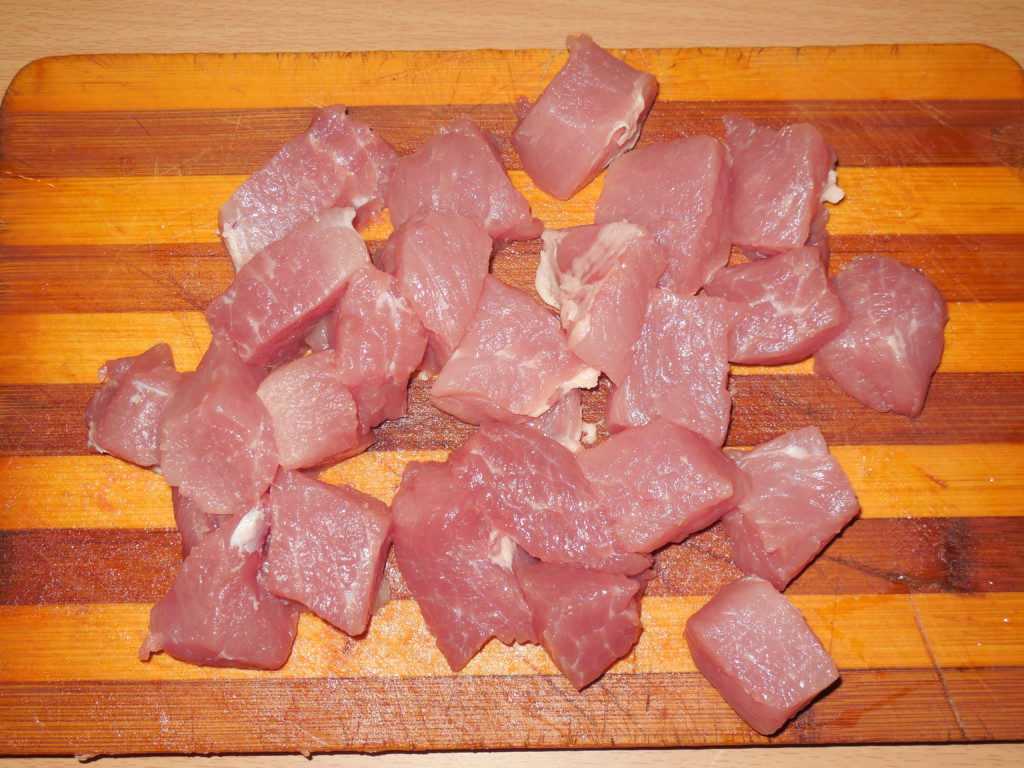 - Свинину тщательно помыть и нарезать на кусочки среднего размера.