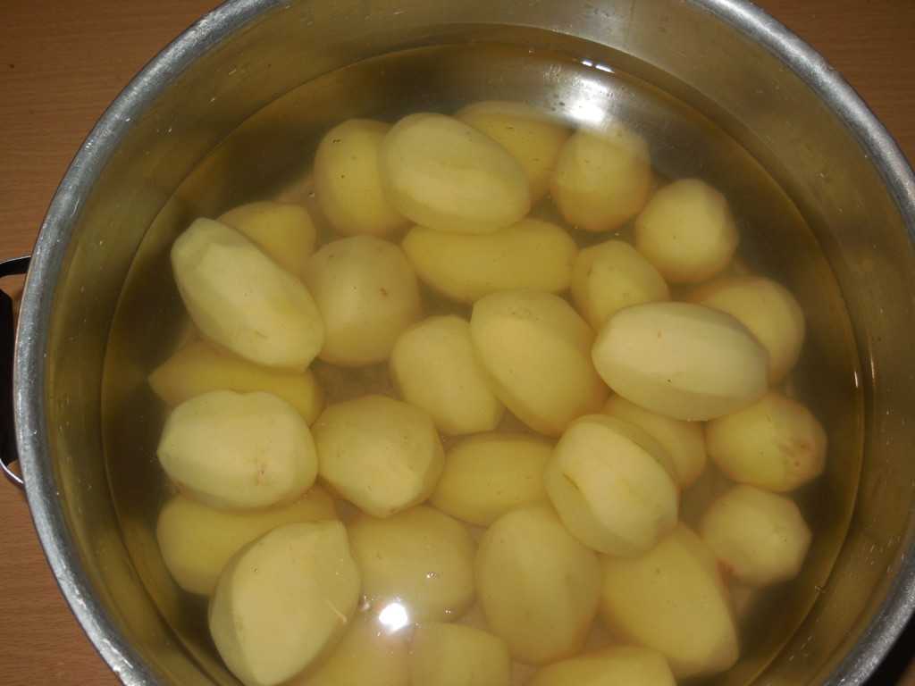 Теперь нам нужно почистить картошку. Очищенный картофель обязательно складываем в кастрюлю наполненную холодной водой, иначе, картошка от контакта с воздухом потемнеет.