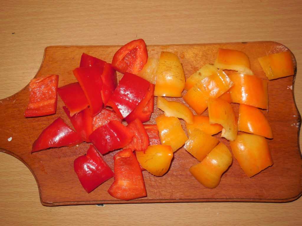 У болгарского перца удаляем плодоножку вместе с семенами и затем, перчик нарезаем достаточно крупными кусочками.