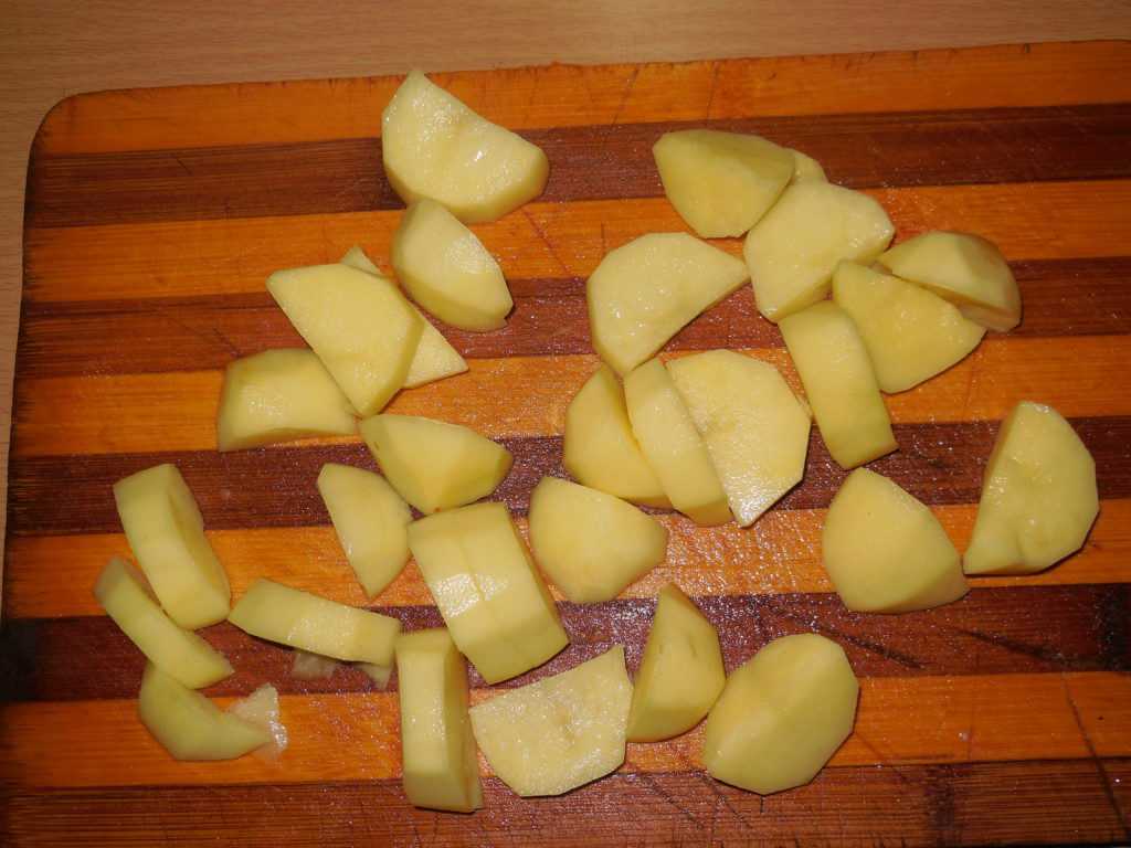 - Картофель очистить от кожуры и порезать крупными кубиками, положить в чашу.