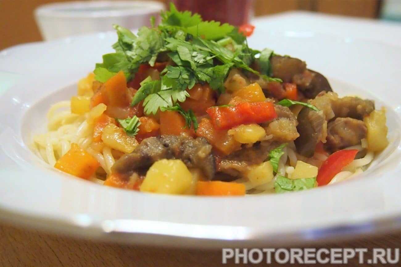 Шаг 14. Разложите лапшу, приготовленную аль денте, в сервировочные тарелки и залейте мясным соусом с овощами. По желанию сверху посыпать зеленью.