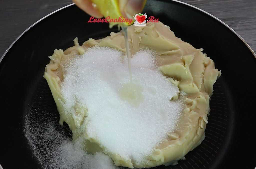От сахара паста станет более жидкой. Выпариваем её на сковороде точно, как и в первый раз.