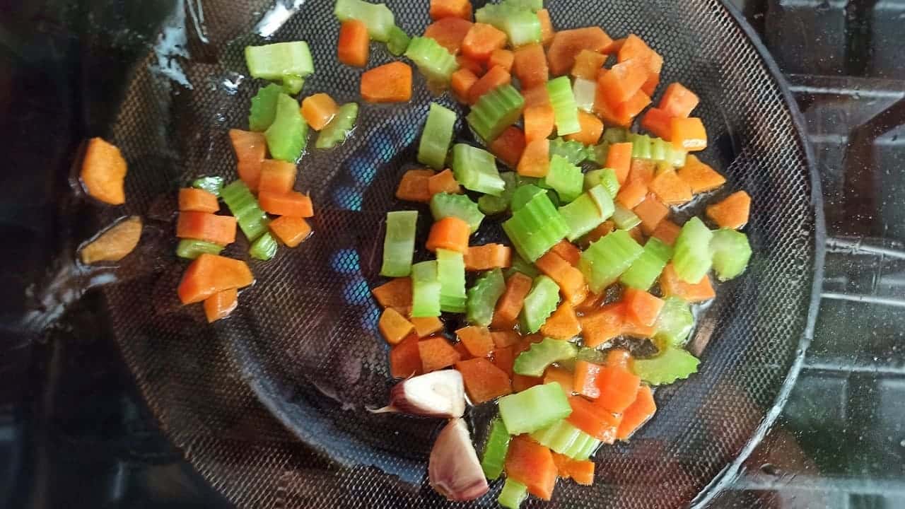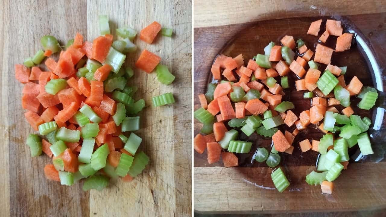 В этот момент помойте овощи и начните нарезать морковь и сельдерей обычными кубиками.
