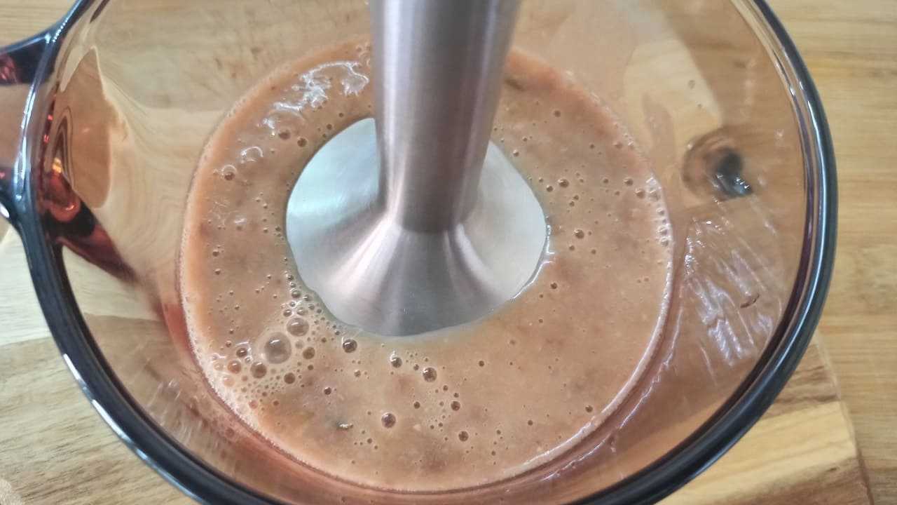 Не сливая отвар, пюрировать блендером до очень нежной, однородной консистенции.