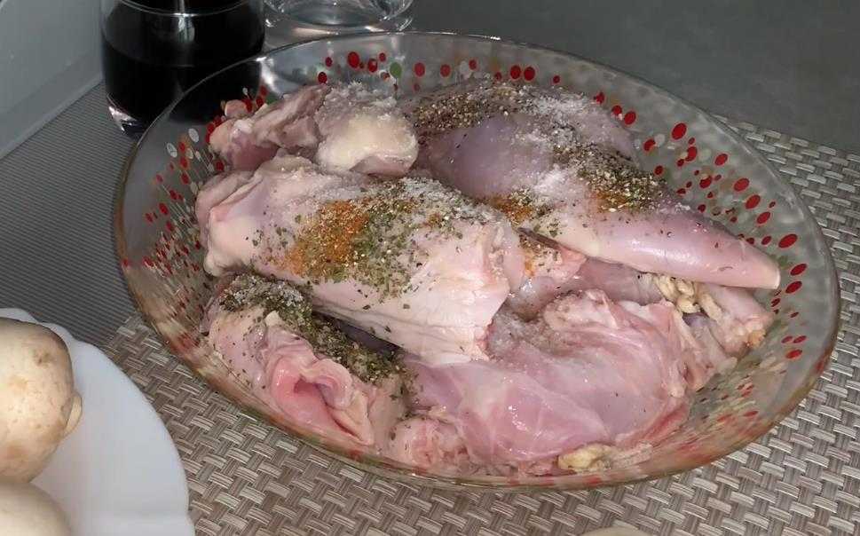 Кроличью тушку нужно разделать на мясные порции. Натрем каждый кусочек солью и перцем.