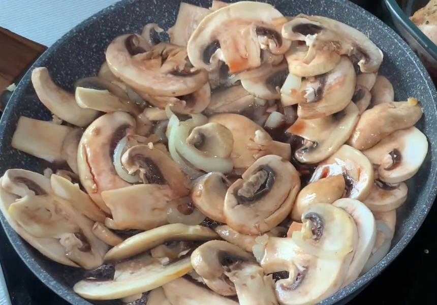 Добавить в сковороду грибы, влить вино и посолить. Держать на огне, периодически помешивая, примерно 10 минут. Перелить полученный соус в форму к мясу.