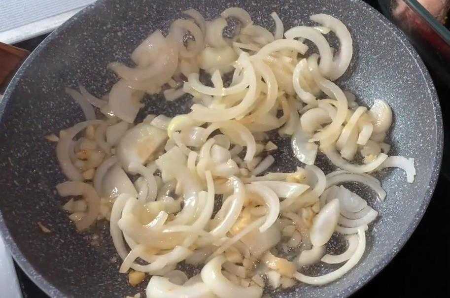 Лук и чеснок мелко нарезать и обжарить на масле 5 минут.
