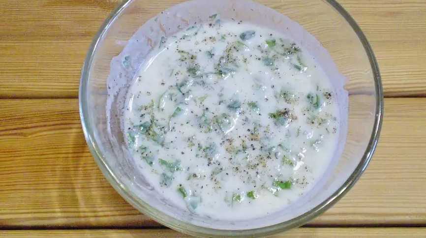 Готовим сметанный соус. Для этого сметану смешаем с травами и куркумой, не забудем также раздавить туда чесночок.