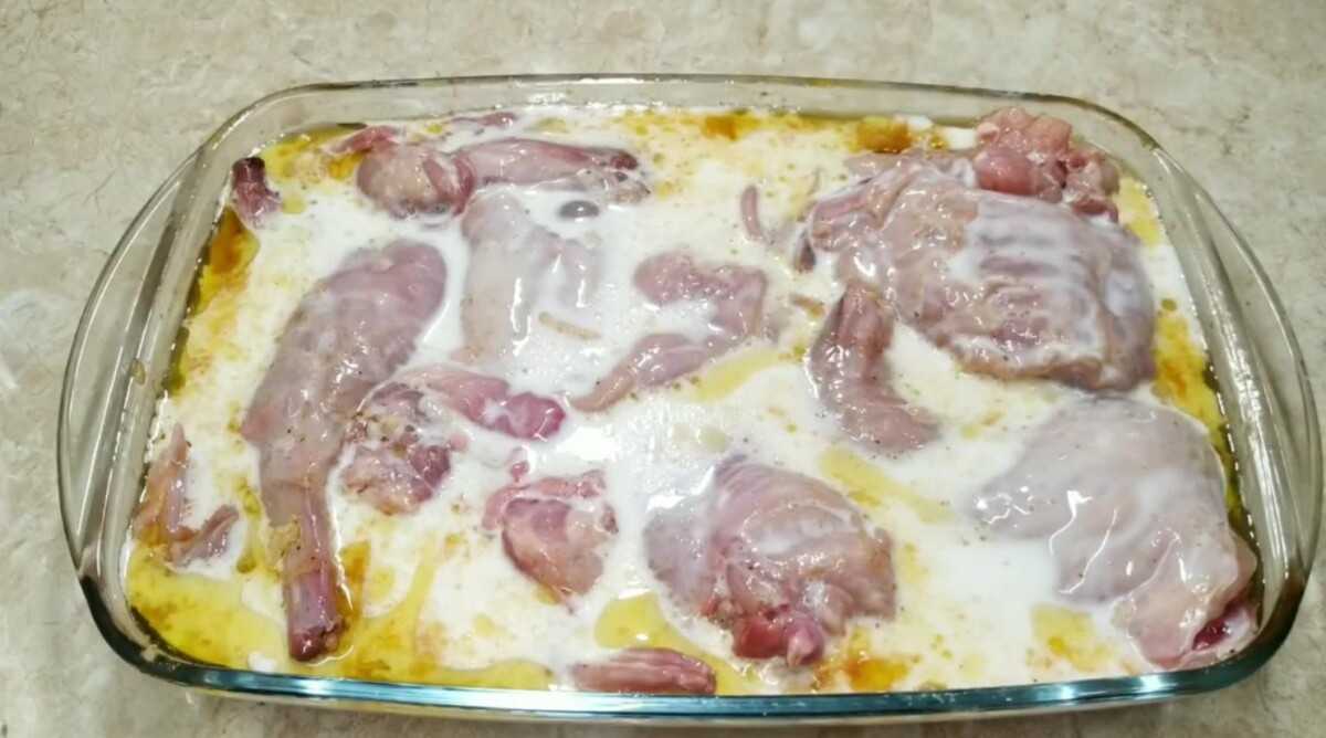 - В форму для запекания вылейте соус, поместите промаринованные кусочки.
