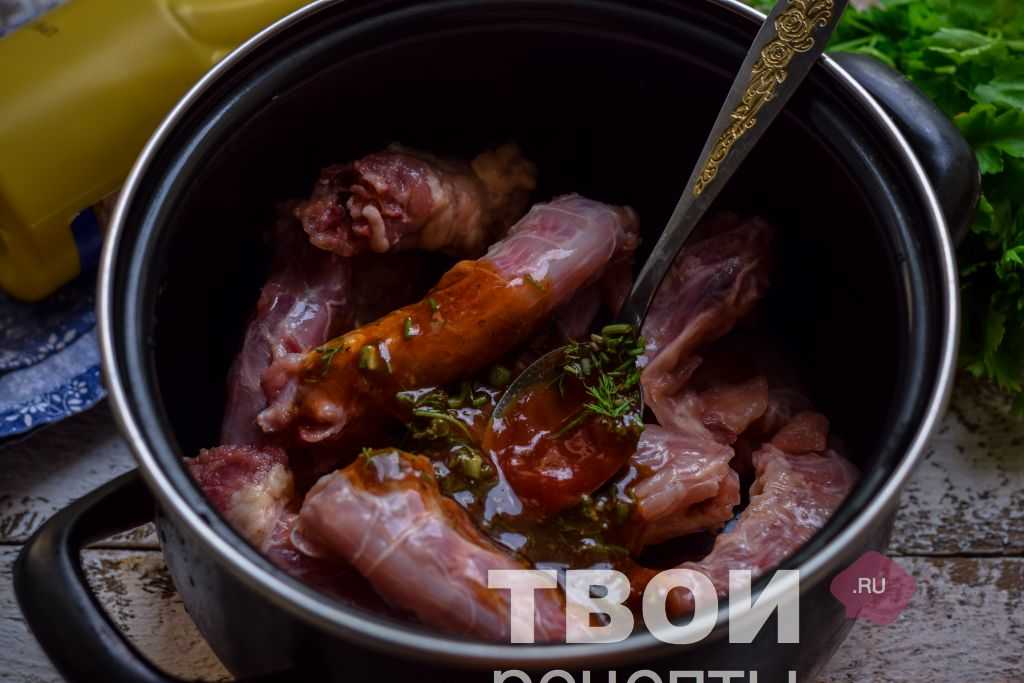 Чтобы мясо получилось сочным и вкусным, его нужно оставить на некоторое время в маринаде. Делают его из сметаны или множества соусов с добавлением овощей. Запекать шеи нужно в духовке при температуре 180 градусов около часа. Такая запеченная закуска может подаваться как с основным блюдом, так и в качестве основного.