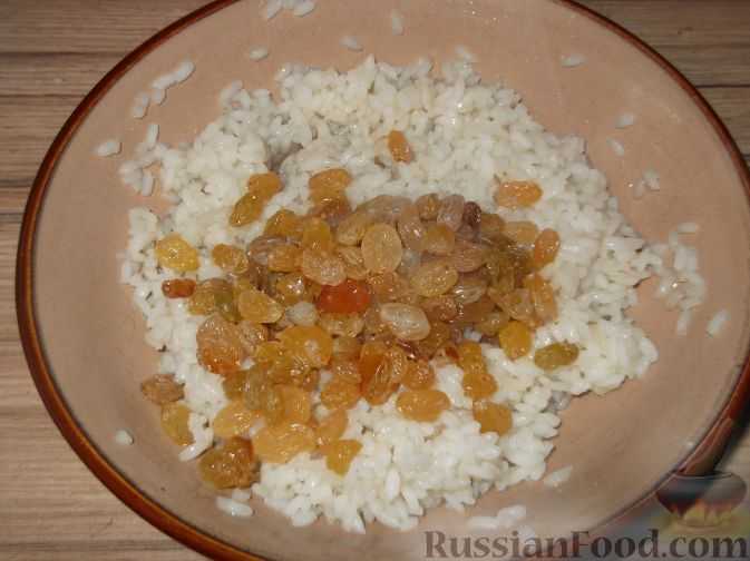 - пока варится рис, необходимо промыть изюм и затем залить его на 1-2 минуты кипятком, после этого выложить его в отдельную посуду, остудить и просушить (при желании добавить другие сухофрукты, с ними поступить также;